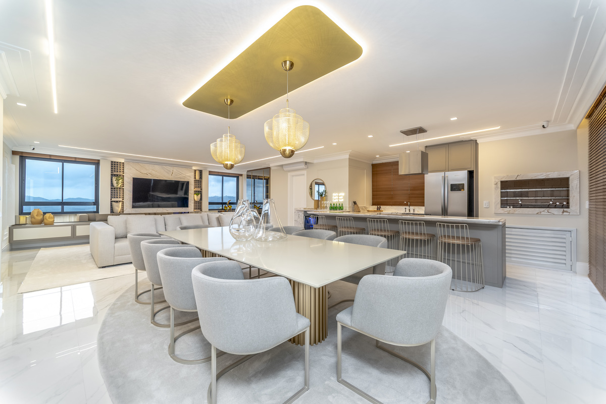 Luz natural, texturas e reflexos compõem o cenário desta cobertura triplex em Itapema, onde cada ambiente foi fotografado explorando o equilíbrio entre sofisticação e acolhimento. A iluminação suave valoriza os tons neutros, o brilho do mármore e o desenho preciso dos móveis, revelando uma atmosfera elegante e contemporânea com vista para o mar.